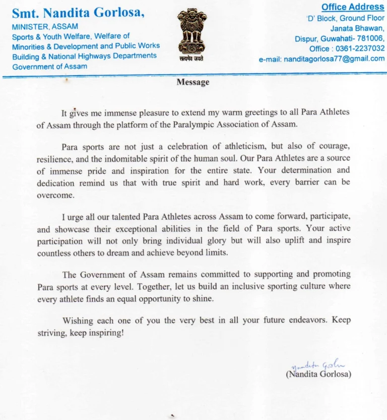 I am honored to extend my heartfelt greetings and profound admiration to each one of you associated with the Paralympic Association of Assam. Your unwavering commitment to promoting inclusivity, resilience, and excellence in sports is truly commendable.